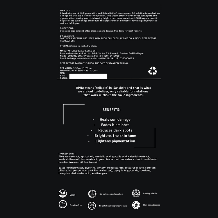 A combined formulation can increase the benefits of both acids. An excellent option that includes both mandelic acid and glycolic acid, is our Āpna Ayurveda Anti-Pigmentation and Detan Daily Cream which is designed to provide these benefits while nourishing your skin.