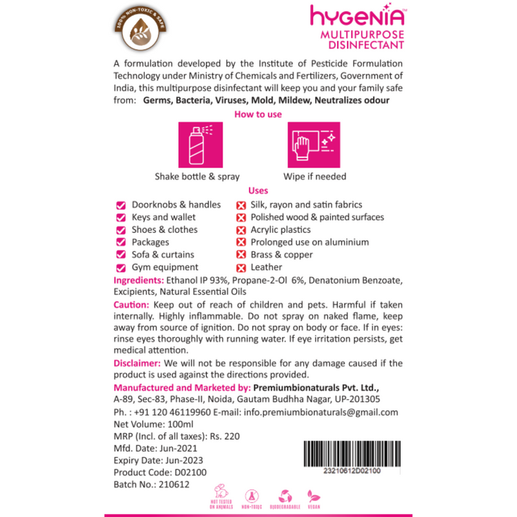 Our multipurpose disinfectant has been formulated by the Institute of Pesticide Formulation and Technology under the Ministry of Chemicals & Fertilizers, Government of India. It is 97% alcohol and waterless which makes it safe for use on electronics and it also comes in a non-aerosol bottle which means more disinfectant, less gas and minimal wastage! So go ahead and peacefully disinfect everything - from keys to wallet to online delivery packages to gym equipments to door handles, you name it!